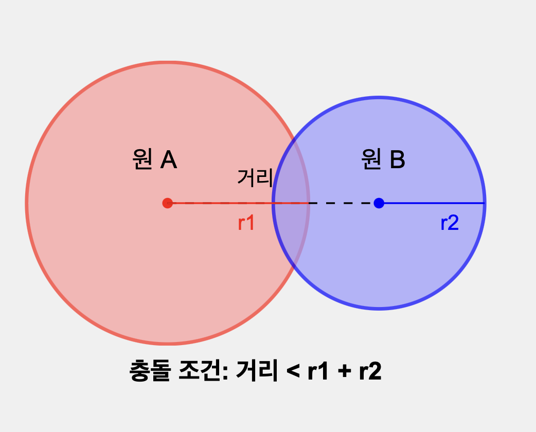 distance(중심1, 중심2) < (반지름1 + 반지름2)