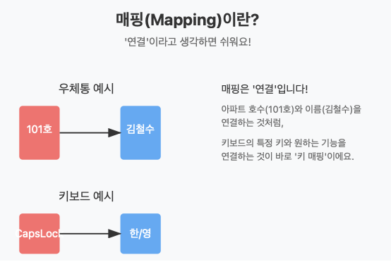 즉, '스페이스바'에 'enter'기능을 연결시키는 겁니다. 이걸 '매핑'이라고 해요.