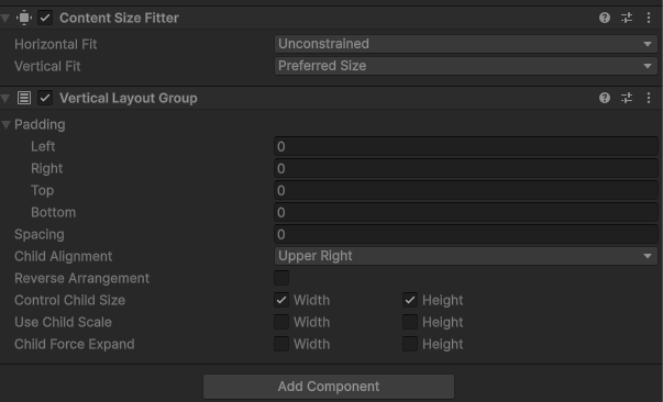 일단 빈게임 오브젝트에는 컴포넌트 중에 'vertical layout group'과 'content size fillter' 컴포넌트를 추가해줍니다.
