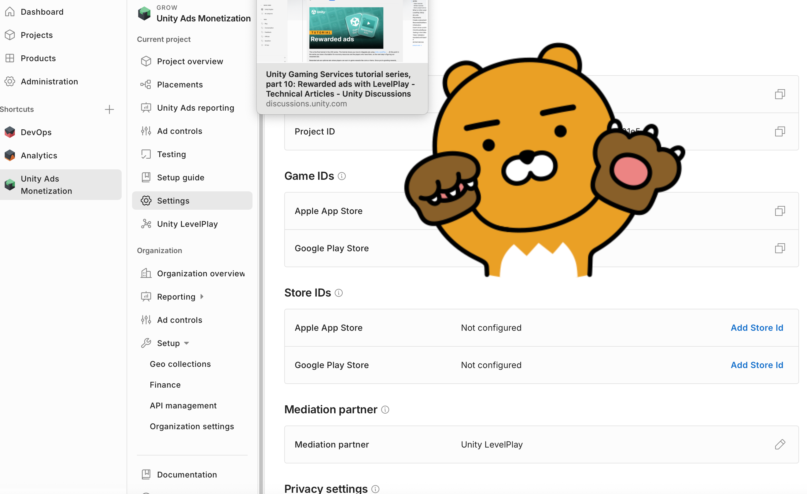 여기에 필요한 api key와 organization code는 다음링크에서 unity ads monetiation 설치해주고