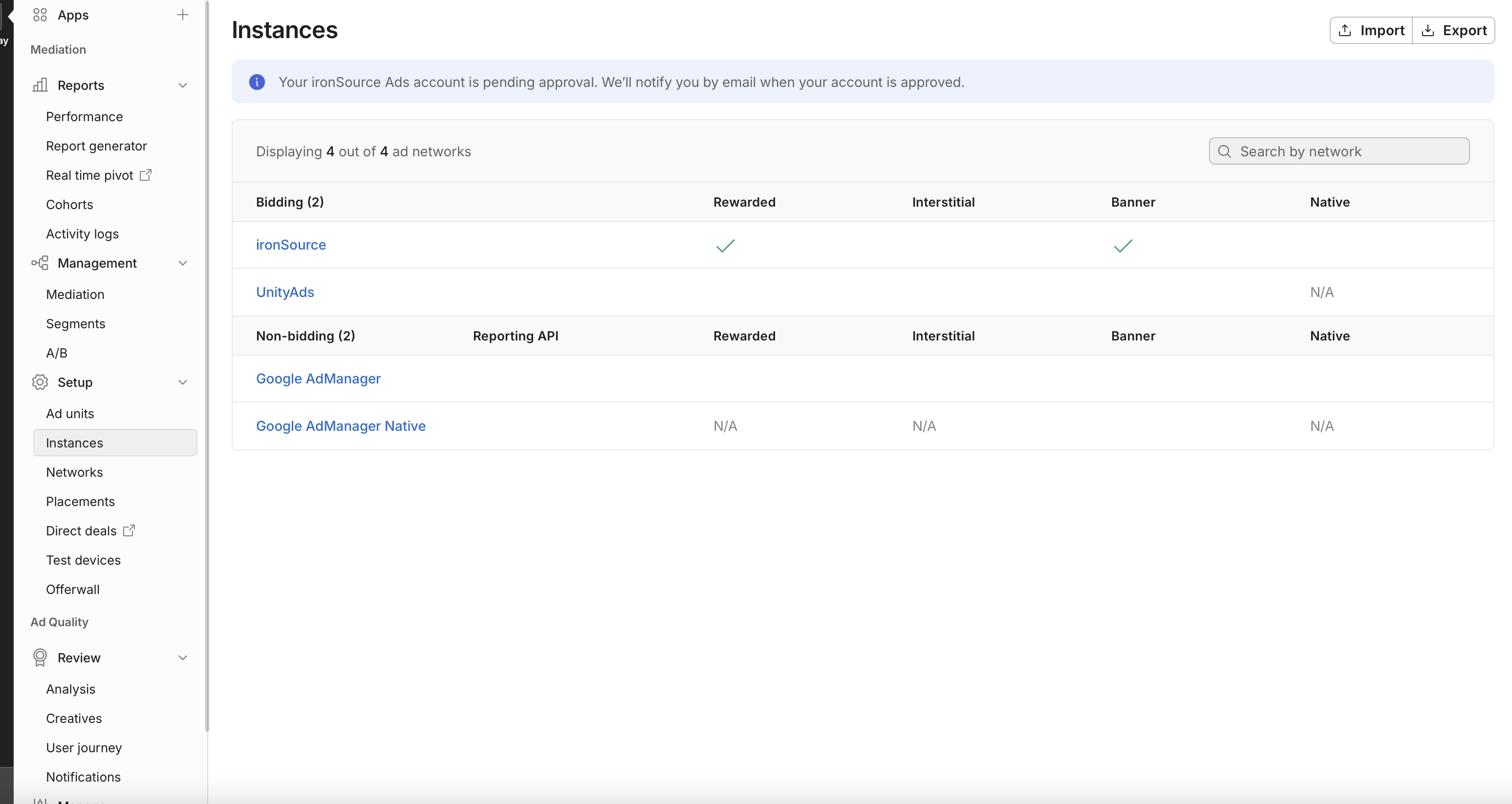 6. 이제 다시돌아와서 setup->instances 클릭하면 아래처럼 연결된 네트워크 뜸. 아 이거 그리고 unityadssdk 는 unity levelplay sdk 깔면서 자동으로 project에 깔리는데 google admanager는 자동 아니니까 꼭 unity project에서 ad monetization -> networkmanager 클릭에서 창 연 후 깔아줘야 함!